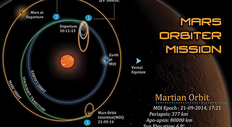 Marking India's first venture into the interplanetary space, MOM will explore and observe Mars surface features, morphology, mineralogy and the Martian atmosphere. Further, a specific search for methane in the Martian atmosphere will provide information about the possibility or the past existence of life on the planet. The enormous distances involved in interplanetary missions present a demanding challenge; developing and mastering the technologies essential for these missions will open endless possibilities for space exploration. After leaving Earth, the Orbiter will have to endure the Interplanetary space for 300 days before Mars capture. Apart from deep space communications and navigation-guidance-control capabilities, the mission will require autonomy at the spacecraft end to handle contingencies. Once India decided to go to Mars, ISRO had no time to lose as the nearest launch window was only a few months away and it could not afford to lose the chance, given the next launch would present itself after over 780 days, in 2016. Thus, mission planning, manufacturing the spacecraft and the launch vehicle and readying the support systems took place swiftly. Click me to read more abot ISRO